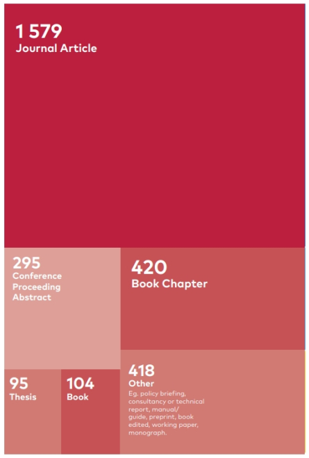 The researchers can choose among 16 different publication types, such as book chapters, monographs, technical reports and conference papers. Publications are results in of themselves, but can also be considered mediators between research and its dissemination, and thus a proxy indicator of any effect.