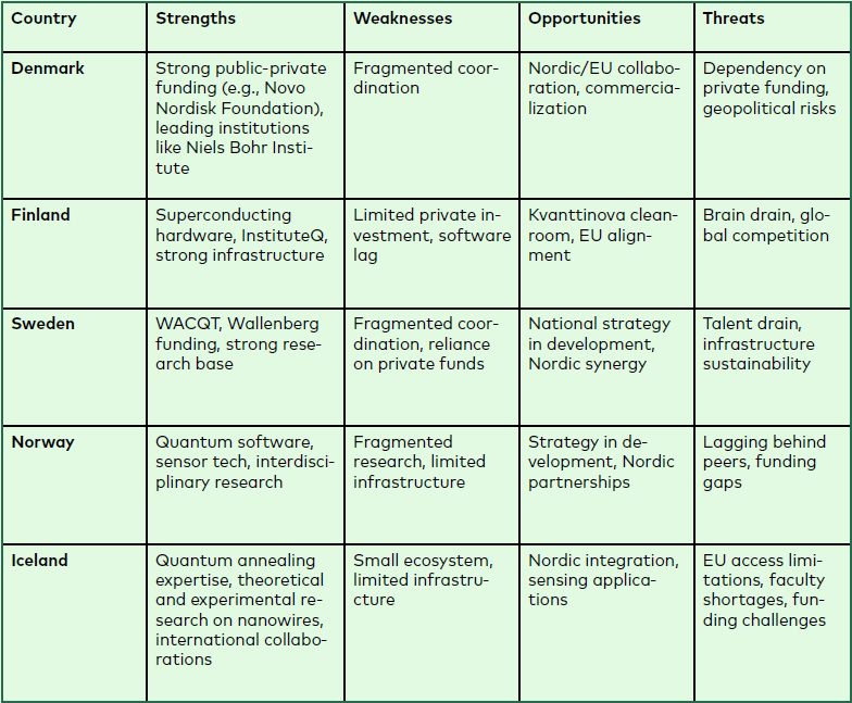 A SWOT analysis was also conducted as part of the Nordic Quantum White Paper (1), and it aligns closely with the present analysis. Notably, the white paper highlights several unique strengths and risks. Among the key strengths is the Nordic region’s consistently high performance on the European Innovation Scoreboard (20), where countries like Sweden, Finland, and Denmark rank among the top in areas such as patent applications, scientific publications, and venture capital investment. This innovation leadership provides a strong foundation for quantum technology development. Additionally, the white paper emphasizes the robust open-access infrastructure (e.g., Myfab, OtaNano, Nanolab), a well-established quantum science and technology (QST) community, and strong industry-academia networks as critical assets.